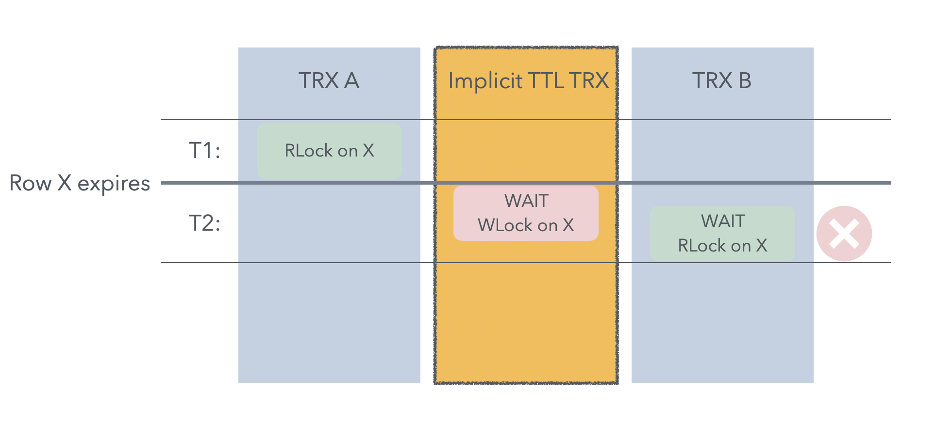 原本的行为,事务B会立刻获取到X读锁。但有了TTL上述定义后,假设在1,2之间X的过期时间到了,那么就要想象有一条隐式的TTL写事务尝试获取并等待在X的写锁上,这就导致事务B也要等待在X的读锁上,直到事务A提交。