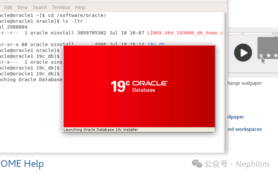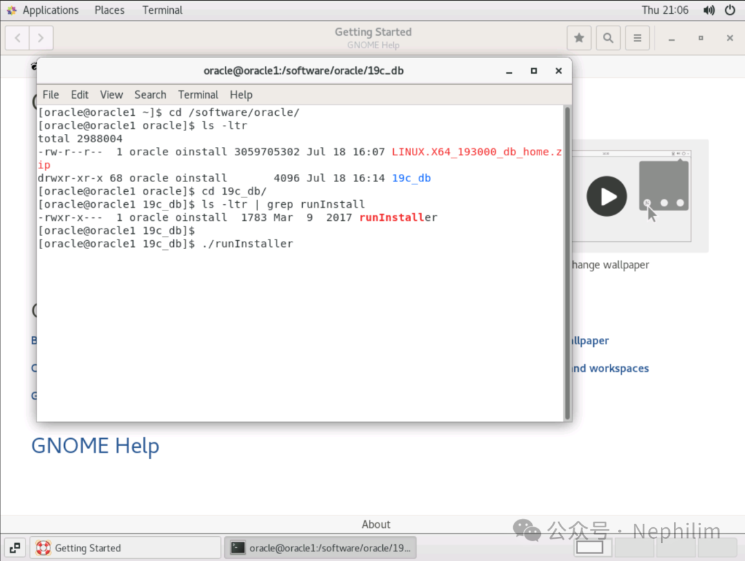 [root@oracle1 oracle]# pwd/software/oracle[root@oracle1 oracle]#[root@oracle1 oracle]# ls -ltrtotal 2631536-rw-r--r-- 1 root root 2694664264 Jul 18 15:29 oracle-database-ee-19c-1.0-1.x86_64.rpm-rw-r--r-- 1 root root 18204 Jul 18 15:50 oracle-database-preinstall-19c-1.0-1.el7.x86_64.rpm[root@oracle1 oracle]#[root@oracle1 oracle]# du -sh *2.6G oracle-database-ee-19c-1.0-1.x86_64.rpm20K oracle-database-preinstall-19c-1.0-1.el7.x86_64.rpm[root@oracle1 oracle]#[root@oracle1 oracle]# yum install bind-utils smartmontools xorg-x11-utils xorg-x11-xauth -yLoaded plugins: fastestmirrorLoading mirror speeds from cached hostfileResolving Dependencies--> Running transaction check---> Package bind-utils.x86_64 32:9.11.4-26.P2.el7_9.16 will be installed--> Processing Dependency: bind-libs-lite(x86-64) = 32:9.11.4-26.P2.el7_9.16 for package: 32:bind-utils-9.11.4-26.P2.el7_9.16.x86_64--> Processing Dependency: bind-libs(x86-64) = 32:9.11.4-26.P2.el7_9.16 for package: 32:bind-utils-9.11.4-26.P2.el7_9.16.x86_64--> Processing Dependency: liblwres.so.160()(64bit) for package: 32:bind-utils-9.11.4-26.P2.el7_9.16.x86_64--> Processing Dependency: libisccfg.so.160()(64bit) for package: 32:bind-utils-9.11.4-26.P2.el7_9.16.x86_64--> Processing Dependency: libisc.so.169()(64bit) for package: 32:bind-utils-9.11.4-26.P2.el7_9.16.x86_64--> Processing Dependency: libirs.so.160()(64bit) for package: 32:bind-utils-9.11.4-26.P2.el7_9.16.x86_64--> Processing Dependency: libdns.so.1102()(64bit) for package: 32:bind-utils-9.11.4-26.P2.el7_9.16.x86_64--> Processing Dependency: libbind9.so.160()(64bit) for package: 32:bind-utils-9.11.4-26.P2.el7_9.16.x86_64--> Processing Dependency: libGeoIP.so.1()(64bit) for package: 32:bind-utils-9.11.4-26.P2.el7_9.16.x86_64---> Package smartmontools.x86_64 1:7.0-2.el7 will be installed---> Package xorg-x11-utils.x86_64 0:7.5-23.el7 will be installed--> Processing Dependency: libdmx.so.1()(64bit) for package: xorg-x11-utils-7.5-23.el7.x86_64--> Processing Dependency: libXxf86misc.so.1()(64bit) for package: xorg-x11-utils-7.5-23.el7.x86_64--> Processing Dependency: libXxf86dga.so.1()(64bit) for package: xorg-x11-utils-7.5-23.el7.x86_64--> Processing Dependency: libXv.so.1()(64bit) for package: xorg-x11-utils-7.5-23.el7.x86_64--> Processing Dependency: libXtst.so.6()(64bit) for package: xorg-x11-utils-7.5-23.el7.x86_64--> Processing Dependency: libXrandr.so.2()(64bit) for package: xorg-x11-utils-7.5-23.el7.x86_64--> Processing Dependency: libXinerama.so.1()(64bit) for package: xorg-x11-utils-7.5-23.el7.x86_64--> Processing Dependency: libXi.so.6()(64bit) for package: xorg-x11-utils-7.5-23.el7.x86_64---> Package xorg-x11-xauth.x86_64 1:1.0.9-1.el7 will be installed--> Running transaction check---> Package GeoIP.x86_64 0:1.5.0-14.el7 will be installed--> Processing Dependency: geoipupdate for package: GeoIP-1.5.0-14.el7.x86_64---> Package bind-libs.x86_64 32:9.11.4-26.P2.el7_9.16 will be installed--> Processing Dependency: bind-license = 32:9.11.4-26.P2.el7_9.16 for package: 32:bind-libs-9.11.4-26.P2.el7_9.16.x86_64---> Package bind-libs-lite.x86_64 32:9.11.4-26.P2.el7_9.16 will be installed---> Package libXi.x86_64 0:1.7.9-1.el7 will be installed---> Package libXinerama.x86_64 0:1.1.3-2.1.el7 will be installed---> Package libXrandr.x86_64 0:1.5.1-2.el7 will be installed---> Package libXtst.x86_64 0:1.2.3-1.el7 will be installed---> Package libXv.x86_64 0:1.0.11-1.el7 will be installed---> Package libXxf86dga.x86_64 0:1.1.4-2.1.el7 will be installed---> Package libXxf86misc.x86_64 0:1.0.3-7.1.el7 will be installed---> Package libdmx.x86_64 0:1.1.3-3.el7 will be installed--> Running transaction check---> Package bind-license.noarch 32:9.11.4-26.P2.el7_9.16 will be installed---> Package geoipupdate.x86_64 0:2.5.0-2.el7 will be installed--> Finished Dependency ResolutionDependencies Resolved=======================================================================================================================================================================================================Package Arch Version Repository Size=======================================================================================================================================================================================================Installing:bind-utils x86_64 32:9.11.4-26.P2.el7_9.16 updates 262 ksmartmontools x86_64 1:7.0-2.el7 base 546 kxorg-x11-utils x86_64 7.5-23.el7 base 114 kxorg-x11-xauth x86_64 1:1.0.9-1.el7 base 30 kInstalling for dependencies:GeoIP x86_64 1.5.0-14.el7 base 1.5 Mbind-libs x86_64 32:9.11.4-26.P2.el7_9.16 updates 159 kbind-libs-lite x86_64 32:9.11.4-26.P2.el7_9.16 updates 1.1 Mbind-license noarch 32:9.11.4-26.P2.el7_9.16 updates 92 kgeoipupdate x86_64 2.5.0-2.el7 updates 35 klibXi x86_64 1.7.9-1.el7 base 40 klibXinerama x86_64 1.1.3-2.1.el7 base 14 klibXrandr x86_64 1.5.1-2.el7 base 27 klibXtst x86_64 1.2.3-1.el7 base 20 klibXv x86_64 1.0.11-1.el7 base 18 klibXxf86dga x86_64 1.1.4-2.1.el7 base 19 klibXxf86misc x86_64 1.0.3-7.1.el7 base 19 klibdmx x86_64 1.1.3-3.el7 base 16 kTransaction Summary=======================================================================================================================================================================================================Install 4 Packages (+13 Dependent packages)Total download size: 4.0 MInstalled size: 10 MDownloading packages:(1/17): bind-libs-9.11.4-26.P2.el7_9.16.x86_64.rpm | 159 kB 00:00:00(2/17): bind-license-9.11.4-26.P2.el7_9.16.noarch.rpm | 92 kB 00:00:00(3/17): GeoIP-1.5.0-14.el7.x86_64.rpm | 1.5 MB 00:00:00(4/17): bind-utils-9.11.4-26.P2.el7_9.16.x86_64.rpm | 262 kB 00:00:00(5/17): bind-libs-lite-9.11.4-26.P2.el7_9.16.x86_64.rpm | 1.1 MB 00:00:00(6/17): geoipupdate-2.5.0-2.el7.x86_64.rpm | 35 kB 00:00:00(7/17): libXi-1.7.9-1.el7.x86_64.rpm | 40 kB 00:00:00(8/17): libXinerama-1.1.3-2.1.el7.x86_64.rpm | 14 kB 00:00:00(9/17): libXrandr-1.5.1-2.el7.x86_64.rpm | 27 kB 00:00:00(10/17): libXtst-1.2.3-1.el7.x86_64.rpm |