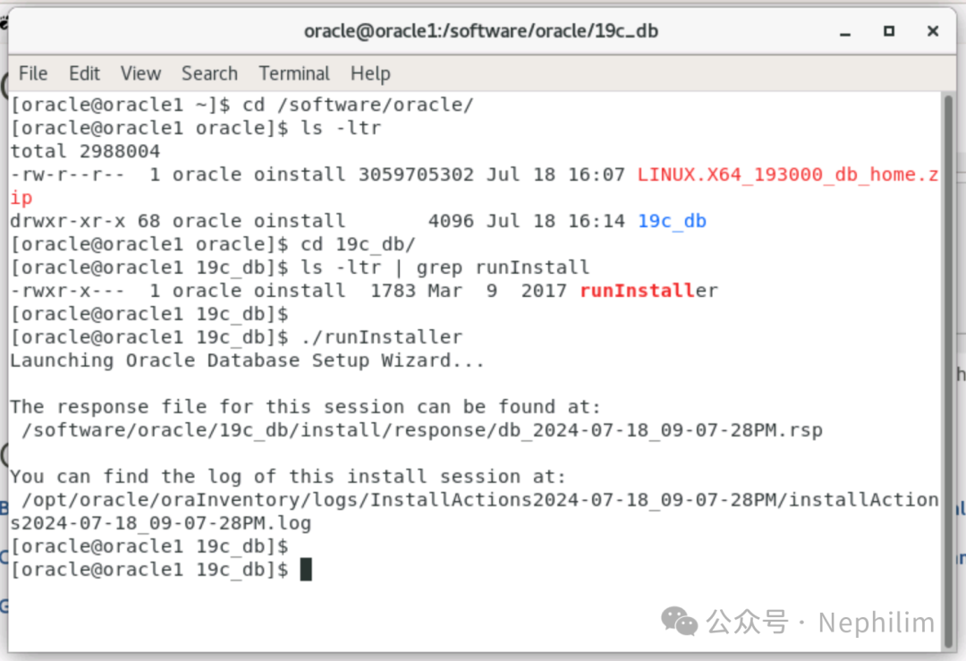 [root@oracle1 oracle]# pwd/software/oracle[root@oracle1 oracle]#[root@oracle1 oracle]# ls -ltrtotal 0[root@oracle1 oracle]#[root@oracle1 software]# unzip LINUX.X64_193000_db_home.zip(过多的输出信息,...)inflating: md/gdal/include/cpl_vsi.hinflating: md/gdal/include/cpl_minizip_unzip.hinflating: md/gdal/include/gnmgraph.hinflating: md/gdal/include/gdal_frmts.hcreating: md/lib/inflating: md/lib/libsdogdal.solinking: bin/lbuilder -> ../nls/lbuilder/lbuilderlinking: lib/libocci.so -> libocci.so.19.1linking: lib/libagtsh.so -> libagtsh.so.1.0linking: lib/libodm19.so -> libodmd19.solinking: lib/libclntsh.so -> libclntsh.so.19.1linking: lib/libjavavm19.a -> ../javavm/jdk/jdk8/lib/libjavavm19.alinking: javavm/lib/jce.jar -> ../../javavm/jdk/jdk8/lib/jce.jarlinking: lib/libocci.so.18.1 -> libocci.solinking: lib/libclntshcore.so -> libclntshcore.so.19.1linking: jdk/bin/ControlPanel -> jcontrollinking: javavm/admin/cbp.jar -> ../../javavm/jdk/jdk8/admin/cbp.jarlinking: lib/libclntsh.so.10.1 -> libclntsh.solinking: lib/libclntsh.so.11.1 -> libclntsh.solinking: lib/libclntsh.so.12.1 -> libclntsh.solinking: lib/libclntsh.so.18.1 -> libclntsh.solinking: precomp/public/SQLCA.H -> sqlca.hlinking: precomp/public/SQLDA.H -> sqlda.hlinking: precomp/public/ORACA.H -> oraca.hlinking: precomp/public/SQLCA.COB -> sqlca.coblinking: precomp/public/ORACA.COB -> oraca.coblinking: javavm/admin/classes.bin -> ../../javavm/jdk/jdk8/admin/classes.binlinking: javavm/admin/libjtcjt.so -> ../../javavm/jdk/jdk8/admin/libjtcjt.solinking: jdk/jre/bin/ControlPanel -> jcontrollinking: javavm/admin/lfclasses.bin -> ../../javavm/jdk/jdk8/admin/lfclasses.binlinking: javavm/lib/security/cacerts -> ../../../javavm/jdk/jdk8/lib/security/cacertslinking: javavm/lib/sunjce_provider.jar -> ../../javavm/jdk/jdk8/lib/sunjce_provider.jarlinking: javavm/lib/security/README.txt -> ../../../javavm/jdk/jdk8/lib/security/README.txtlinking: javavm/lib/security/java.security -> ../../../javavm/jdk/jdk8/lib/security/java.securitylinking: jdk/jre/lib/amd64/server/libjsig.so -> ../libjsig.soextracting: install/.img.binfinishing deferred symbolic links:bin/lbuilder -> ../nls/lbuilder/lbuilderlib/libocci.so -> libocci.so.19.1lib/libagtsh.so -> libagtsh.so.1.0lib/libodm19.so -> libodmd19.solib/libclntsh.so -> libclntsh.so.19.1lib/libjavavm19.a -> ../javavm/jdk/jdk8/lib/libjavavm19.ajavavm/lib/jce.jar -> ../../javavm/jdk/jdk8/lib/jce.jarlib/libocci.so.18.1 -> libocci.solib/libclntshcore.so -> libclntshcore.so.19.1jdk/bin/ControlPanel -> jcontroljavavm/admin/cbp.jar -> ../../javavm/jdk/jdk8/admin/cbp.jarlib/libclntsh.so.10.1 -> libclntsh.solib/libclntsh.so.11.1 -> libclntsh.solib/libclntsh.so.12.1 -> libclntsh.solib/libclntsh.so.18.1 -> libclntsh.soprecomp/public/SQLCA.H -> sqlca.hprecomp/public/SQLDA.H -> sqlda.hprecomp/public/ORACA.H -> oraca.hprecomp/public/SQLCA.COB -> sqlca.cobprecomp/public/ORACA.COB -> oraca.cobjavavm/admin/classes.bin -> ../../javavm/jdk/jdk8/admin/classes.binjavavm/admin/libjtcjt.so -> ../../javavm/jdk/jdk8/admin/libjtcjt.sojdk/jre/bin/ControlPanel -> jcontroljavavm/admin/lfclasses.bin -> ../../javavm/jdk/jdk8/admin/lfclasses.binjavavm/lib/security/cacerts -> ../../../javavm/jdk/jdk8/lib/security/cacertsjavavm/lib/sunjce_provider.jar -> ../../javavm/jdk/jdk8/lib/sunjce_provider.jarjavavm/lib/security/README.txt -> ../../../javavm/jdk/jdk8/lib/security/README.txtjavavm/lib/security/java.security -> ../../../javavm/jdk/jdk8/lib/security/java.securityjdk/jre/lib/amd64/server/libjsig.so -> ../libjsig.so[root@oracle1 software]#