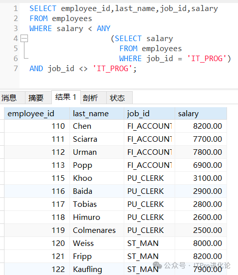 示例: 返回其它job_id中比job_id为‘IT_PROG’部门任一工资低的员工的员工号、姓名、job_id 以及salary