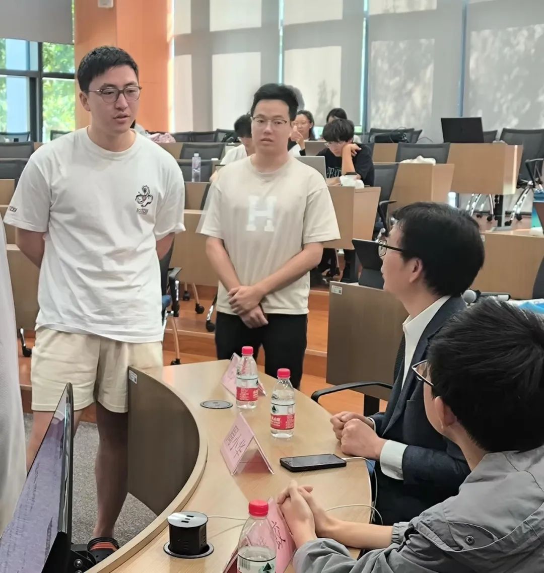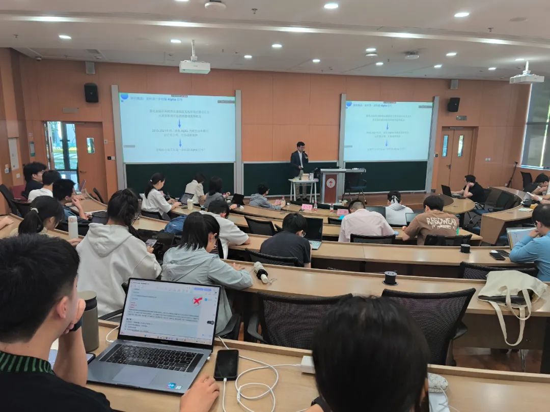 讲座尾声,周博士与大家探讨了交易系统构建和 AI 应用的前沿技术。他详细介绍了 DolphinDB 的一系列强大功能,包括因子开发管理平台、实时曲线拟合引擎、实时估值定价引擎,以及 CPU-GPU 异构计算平台 Shark 等。同学们积极与周博士互动,现场气氛活跃。