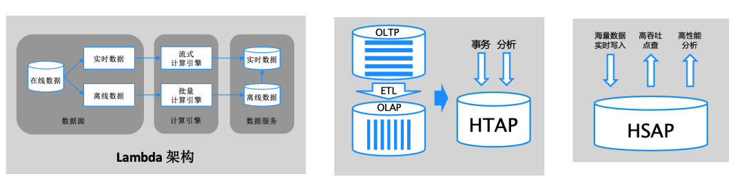 OLTP 作为面向在线交易的场景,往往具有短事务和小数据量的特点,专注于事务处理的并发性和快速性。与 OLTP 对应的是 OLAP,面向数据分析和决策支持的场景,往往涉及大量数据的分析,专注于查询的复杂性。然而,现代 OLTP 往往会有数据分析的需求,基于事务数据实时提供分析视图,因此数据分析能力也是一种应用敏捷性。典型的数据分析流派有 Lambda、HTAP、HSAP,代表了若干着不同的设计理念。