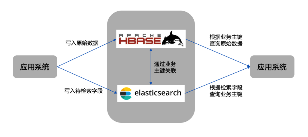 在线业务往往有着数据检索的需求,一个成熟的解决方案是在主数据库之外联合查询引擎一起提供数据服务,两者之间的数据通过业务主键关联。主数据库用于存储原始数据,同时把待检索字段和业务主键写入查询引擎里面建立索引,查询时先基于检索字段去查询引擎获取业务主键,再基于业务主键去主数据库获取完整的原始数据。多存储架构会引入数据一致性的问题,例如应用在主数据库写入成功,但在查询引擎写入失败,此时会发送一个补偿消息到消息队列用于异步重试,从而达到数据的最终一致性。一个被广泛使用的产品组合为 HBase + ElasticSearch + MQ,其架构图如下: