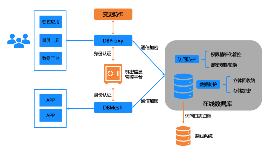 密钥托管及认证:将访问数据库的账密加密托管到机密信息管控平台,应用程序通过专用 SDK 基于身份信息去机密信息管控平台获取账密,应用程序自身对账密零接触