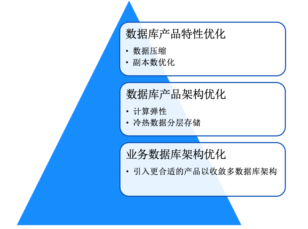 数据库产品特性优化与产品成熟度息息相关,产品成熟度越高,越需要在成本优化上投入精力。一个优化手段是数据压缩技术,采用合适的编码+压缩技术能够进一步提升数据压缩比,或者面向数据类型而优化,例如面向列存的优化技术,面向时序数据的优化技术。另一个优化手段是优化副本数,现代数据库往往采用多副本技术以提升容灾能力,在产品早期往往采用相对成熟的方案快速验证市场,此时副本数不一定是最优的,但随着产品发展,冗余副本会极大增加业务的数据库成本负担,此时必须将副本数优化提上日程。