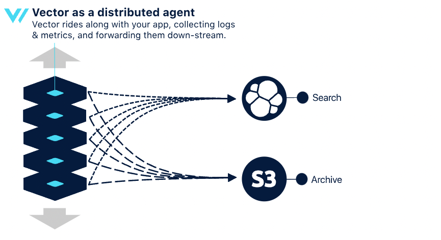 在分布式拓扑中,可以在每个客户端节点上安装 Vector 代理。其中 Vector 直接在客户端节点与下游服务之间进行通信。在这种模式下,每个客户端节点都充当数据收集和转发的角色。Vector 代理会独立运行,处理来自本地资源(如应用程序日志、系统指标等)的数据。这种拓扑的设计理念是避免中间层,直接将数据传输到目标系统。