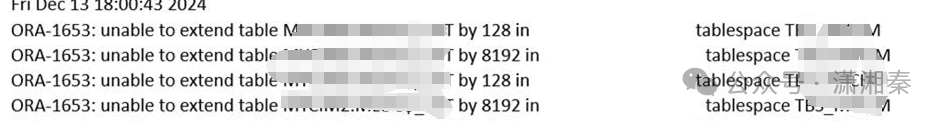 12/13我司某基地MES全厂停线,系统卡死不可用,通知到我排查,查看alert log看到是表空间不足