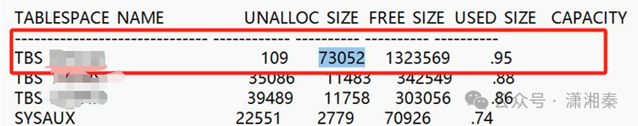 当下查询该表空间使用率,发现该表空间还剩余73GB 那为什么会报表空间不足呢?为了不耽误系统使用,我先添加了四个数据文件,来解决此问题;