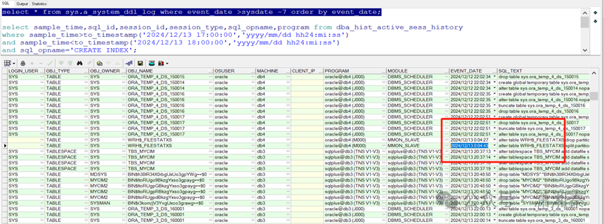 在和oracle support沟通中提到CTAS失败可能会导致被占用的空间释放,那么我们查询问题时段的sql看看都有哪些操作