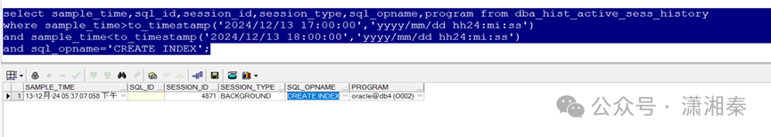 select distinct sql_opname from dba_hist_active_sess_history where sample_time>to_timestamp('2024/12/13 17:00:00','yyyy/mm/dd hh24:mi:ss') and sample_time<to_timestamp('2024/12/13 18:00:00','yyyy/mm/dd hh24:mi:ss');