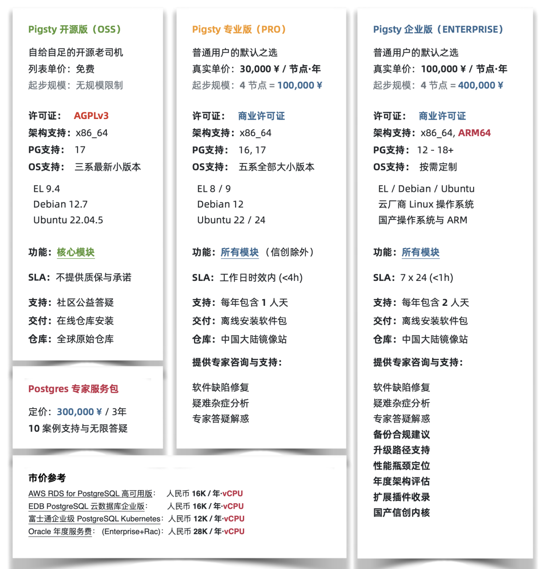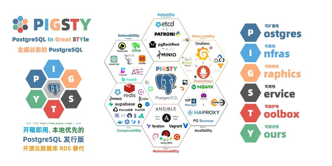 马上 Neon 和 OrioleDB 也要加入进来 —— Pigsty 能为这些 PG 分支/衍生内核提供完善的高可用,备份,连接池,扩展插件。将简单的 RPM 改造成一个开箱即用的云数据库服务。这意味着只要你是 PostgreSQL 生态的内核公司(没有瞎魔改),那么你就能从 Pigsty 的工作中享受到免费红利。从而打造一个互惠共赢的生态。