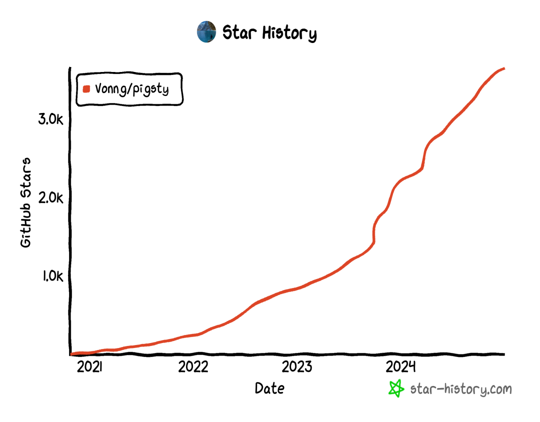 从运营指标上看,Pigsty 从年初的 2200 Star 到年底的 3645,虽然比不了去年的3倍增长,但也有可观的 50% 增长,收获了 1400 多 Star。