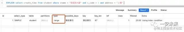 EXPLAIN select create_time from student where address = "上海" and s_code = 1 -- 会走索引吗?