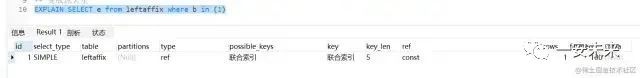 在 WHERE 子句中,如果在 OR 前的条件列是索引列,而在 OR 后的条件列不是索引列,那么索引会失效 举个例子,比如下面的查询语句,b 是主键,e 是普通列,从执行计划的结果看,是走了全表扫描。