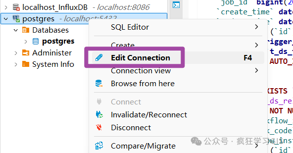 首先,在对应的PostgreSQL数据库连接上右键,选择“Edit Connection”选项,如下图所示。