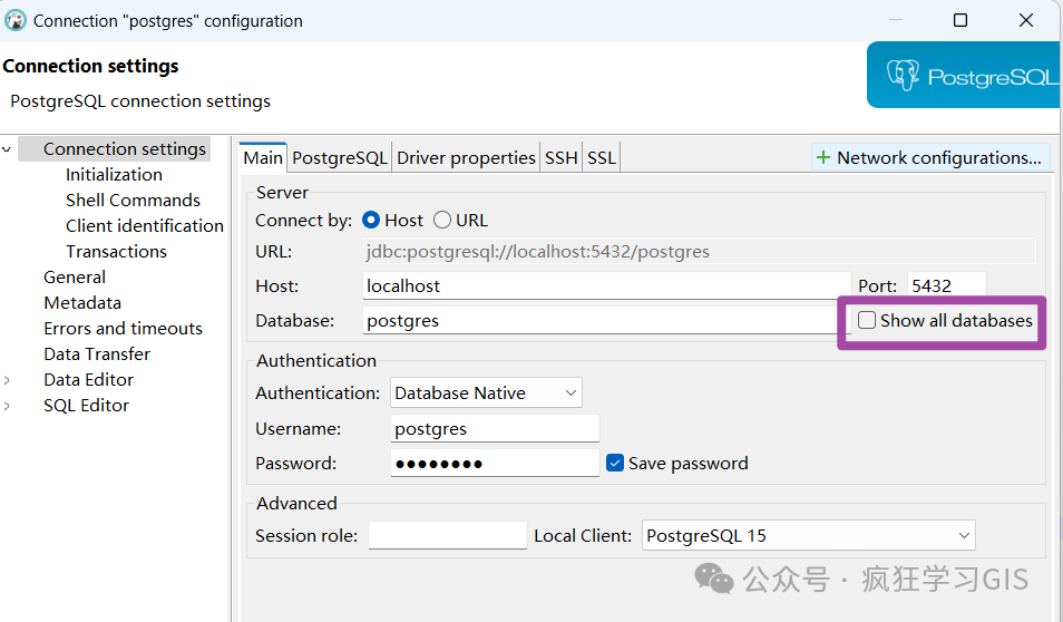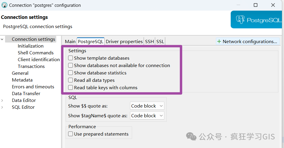 但是,对于部分DBeaver版本,在连接设置界面的上述“Main”栏目中可能无法找到上图所示的勾选项。针对这种情况,大家就在这个界面的第二个栏目——也就是“PostgreSQL”这个栏目下,查找一下其中的几个勾选项;如下图所示。