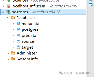 经过上述设置,我们就可以在DBeaver左侧的数据库连接中,看到我们其他的PostgreSQL数据库了;如下图所示。
