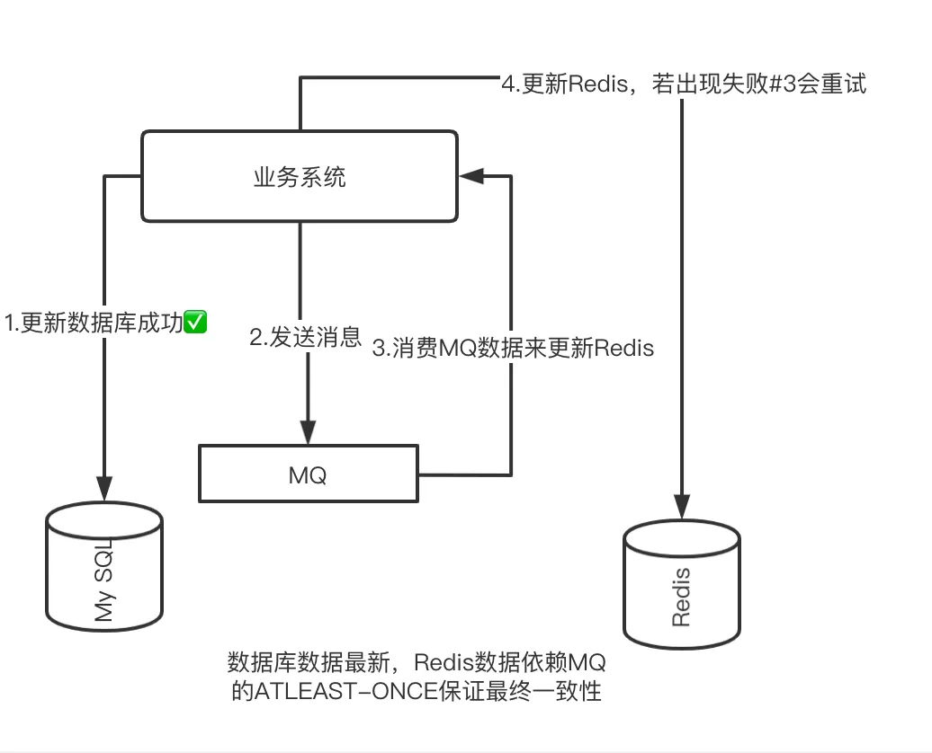 我们把删除 Redis 的请求以消费 MQ 消息的手段去失效对应的 Key 值,如果 Redis 真的存在异常导致无法删除成功,我们依旧可以依靠 MQ 的重试机制来让最终 Redis 对应的 Key 失效。