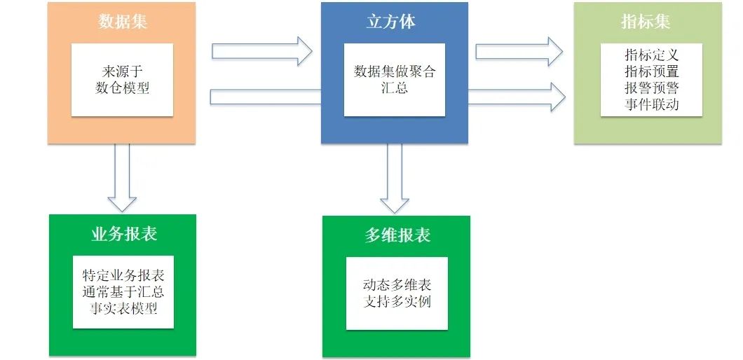 ,通过上述Doris数据中创建数仓模型构建分析模型,立方体来源于数据集,指标集来源于数据集或者立方体、业务报表来源于数据集、多维分析来源立方体。