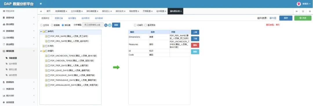 点击页面布局,然后点击组件配置,将对应的维度和指标都进行配置:
