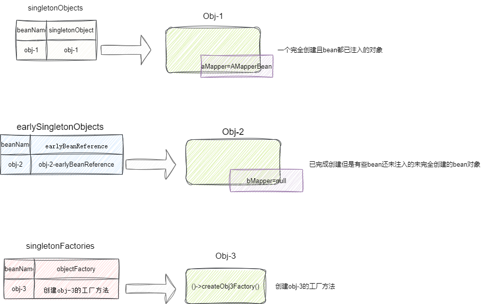 //若earlySingletonObjects还是没有则通过DCL通过singletonFactories创建一个bean并返回