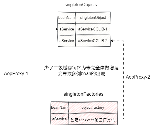被两个加强类代理,假设执行到动态代理时这个类还未创建完全,如果少了二级缓存earlySingletonObjects