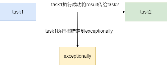 假如我们的任务1执行过程中可能报错,我们希望能够从逻辑的角度处理掉,那么我们就可以在任务1后面接一个exceptionally方法,然后再接上任务2。这样一来,任务1执行报错就会走到exceptionally,反之就会走到任务2的代码段。