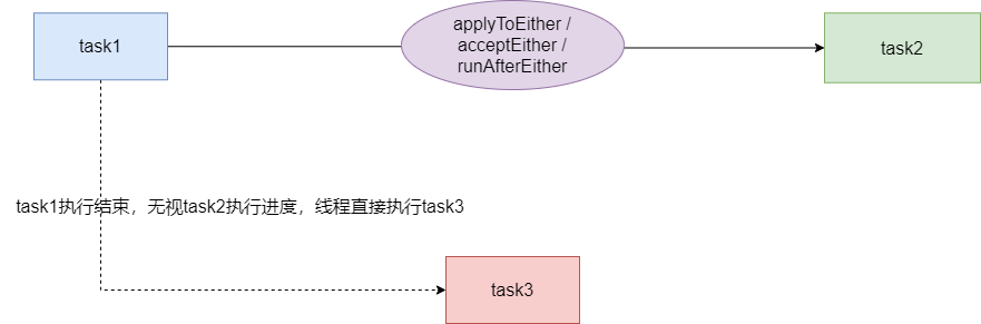 public static void main(String[] args) throws ExecutionException, InterruptedException {CompletableFuture<Integer> task = CompletableFuture.supplyAsync(() -> 1);CompletableFuture<Integer> task2 = CompletableFuture.supplyAsync(() -> 2);CompletableFuture<String> completableFuture = task.applyToEither(task2, (result) -> {if (result == 1) {System.out.println("task1先完成任务");return "task1";}System.out.println("task2先完成任务");return "task2";});System.out.println("最先完成任务的是:" + completableFuture.get());}