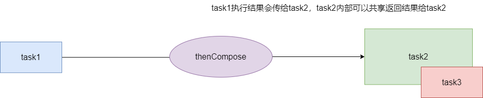 thenCompose方法会在某个任务执行完成后,将该任务的执行结果作为方法入参然后执行指定的方法,该方法会返回一个新的CompletableFuture实例,例如我们希望任务1执行完成后执行任务2,任务2执行完成后返回执行任务3,最终结果是从任务3中获取。