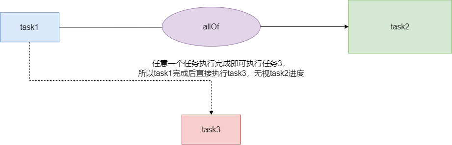 而anyOf则是只要有一个任务完成就可以触发后续方法,并且可以返回先完成任务的返回值,这一点和上述applyToEither 例子差不多。