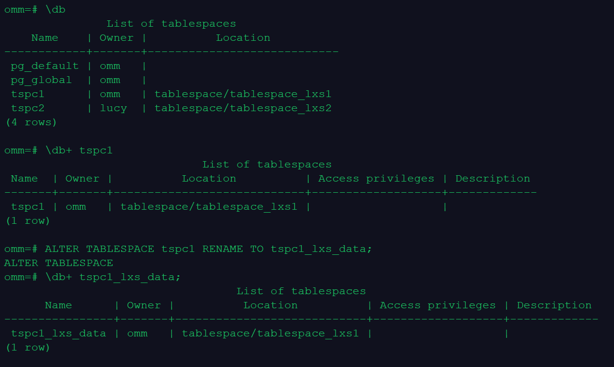omm=# ALTER TABLESPACE tspc1 RENAME TO tspc1_lxs_data;