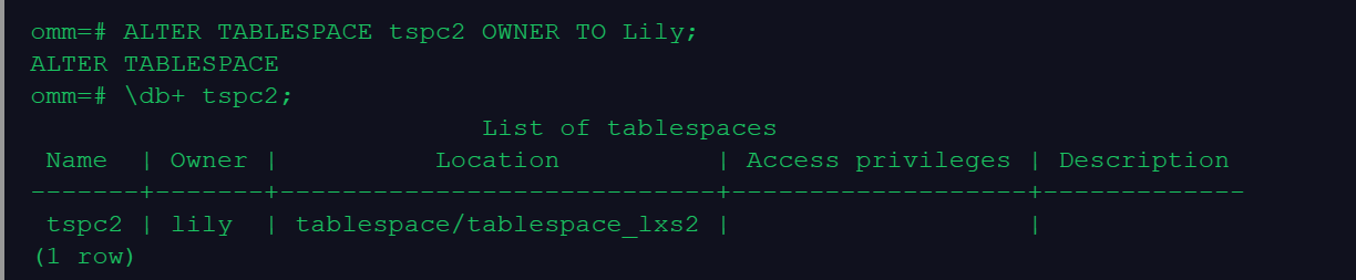 omm=# ALTER TABLESPACE tspc2 OWNER TO Lily;