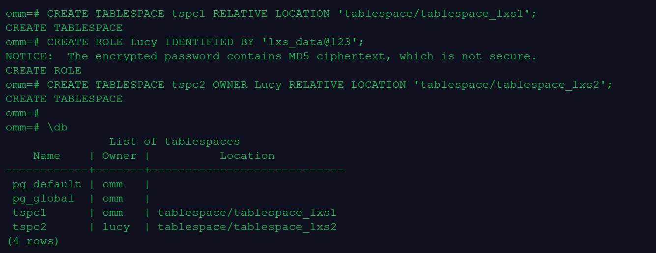 omm=# CREATE TABLESPACE tspc2 OWNER Lucy RELATIVE LOCATION 'tablespace/tablespace_lxs2';