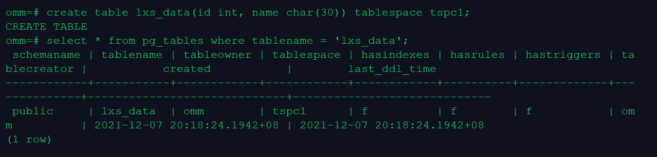 omm=# create table lxs_data(id int, name char(30)) tablespace tspc1;