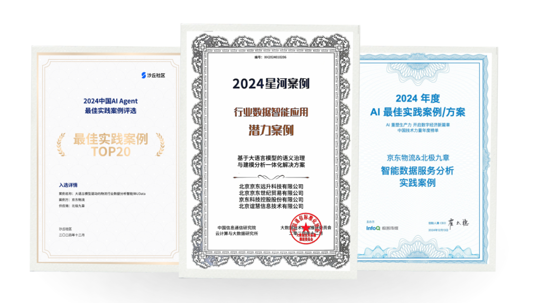 整体解决方案框架基于 “AI for Data” 理念,结合京东自研大模型以及京东物流的 UData 数据平台,构建从数据治理到数据应用的全链条 AI 解决方案,覆盖数据分析全流程,从用户提出问题、获得洞察到了解行业动态。