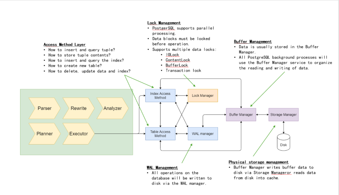 执行器模块依赖于其他几个模块来完成查询。它很可能会与访问方法层(表和索引访问方法)接口,该层负责实际的数据操作(读取或写入)或表和索引数据。访问方法层又依赖于其他模块(缓冲区管理器和存储管理器)来处理实际的数据读写。