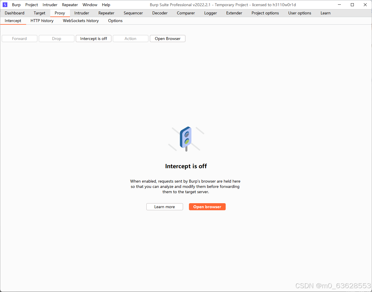 这个页面是截取数据包,能够阻拦网页的正常请求,从而截取数据包。其中Forward就是允许数据包通过,Drop是丢弃当前数据包。Intercept is off/on是关闭和打开的意思。