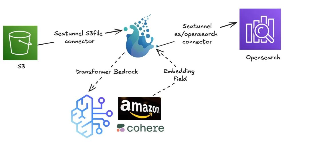 在本方案中,我们以 Apache SeaTunnel 为数据处理主干,利用其 Source 模块从业务数据库/对象存储中实时提取原始数据,使用 Transform 模块调用 Amazon Bedrock 接口完成文本向量化,最终通过 Sink 模块将结果写入 Amazon OpenSearch,构建支持语义检索的向量索引。