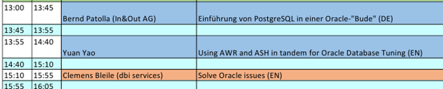 会议吸引了来自Oracle公司、CERN、EDB等机构的专家,如Mike Dietrich、Daniel Westermann、Laurenz Albe和Dani Schnider等人。我的演讲:结合AWR与ASH优化Oracle性能