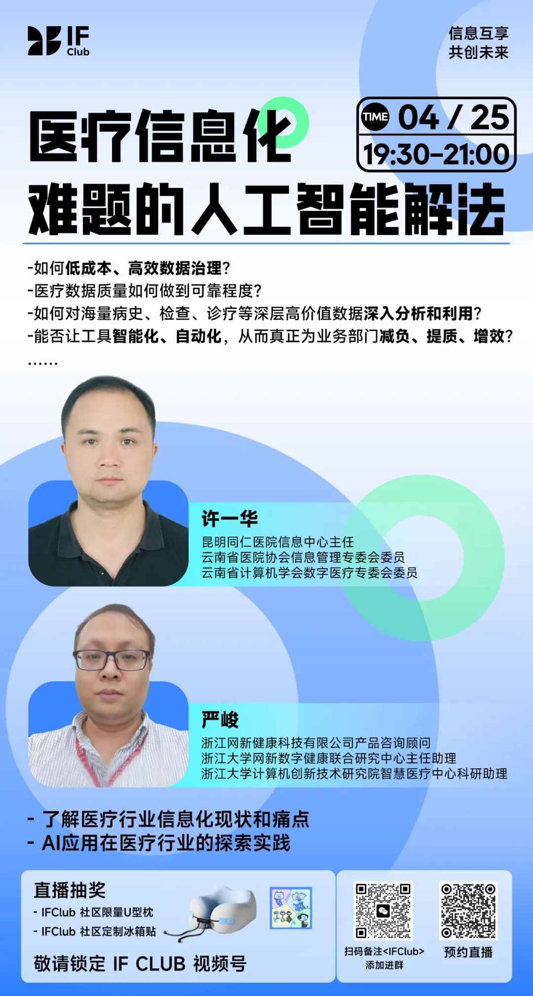 这场直播将为大家解答医疗信息化过程中许多棘手的问题,带来人工智能的应用思路和解决方案。小伙伴们,让我们约起来。