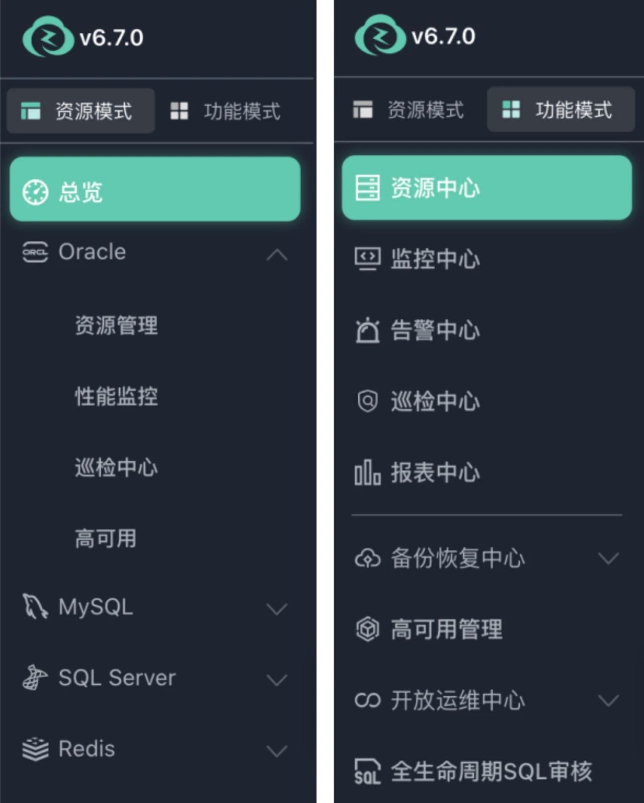 功能模式菜单适用于用户管理的数据库类型较多的情况,这在多元数据库时代已越来越常见。而原有的资源模式菜单,适合于一个用户只管理少数种类数据库的场景,鉴于仍有部分用户只需管理少数数据库或习惯使然,该模式的菜单继续保留。当然,用户可根据自身的管理习惯或需要,选择适合自己的菜单模式。