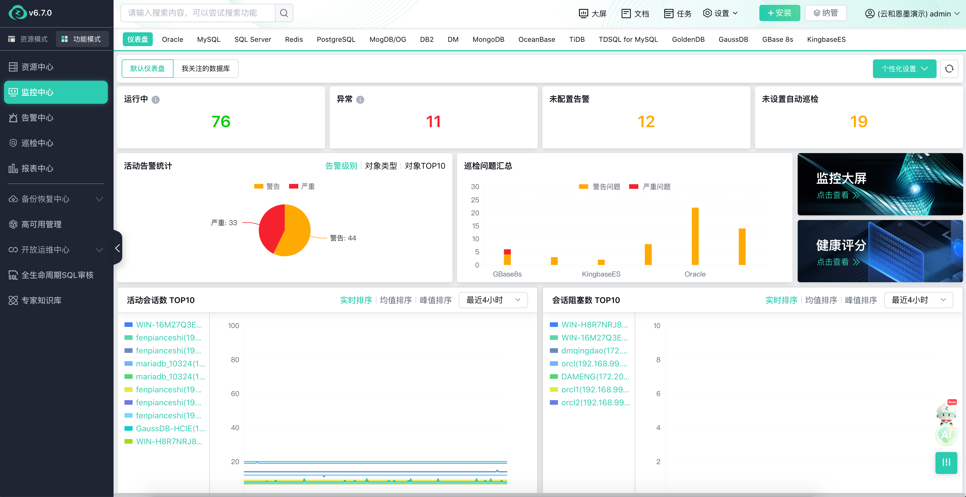 下图中,默认的仪表盘展示了全局信息,包括告警问题数、巡检问题数等,更是展示了最需关注的全局TOP关键指标,如活动会话TOP的数据库、阻塞数TOP的数据库等,同时也链接了其他功能的入口,可以实现一键跳转,如监控大屏、健康评分等。