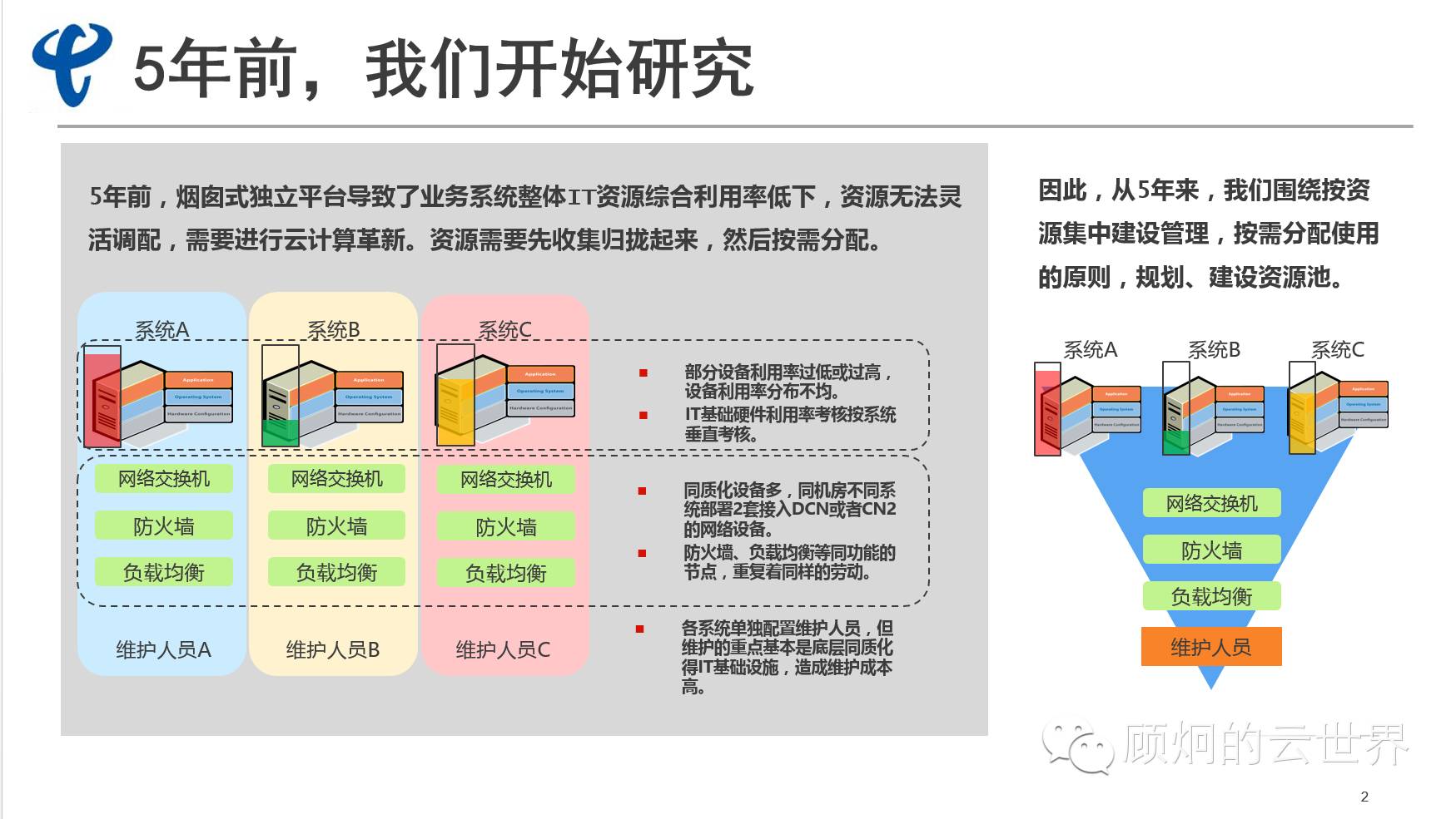 2011年前,我们的系统都是烟囱式的,一个系统就是一个完整麻雀,虽然很小,但是五脏俱全。有独立的网络、安全、存储设备、服务器等。维护人员不但要维护软件还要维护硬件。系统内大部分设备的利用率很低,个别设备却还在不断的扩容。物理机时代大家预测的需求往往是一年起,甚至二年,IT资源的闲置、运营费用,都是极大的浪费。虽然那时开始集中采购,但是没有控制需求源头,没有按需分配,IT设备的单价下降不少,但是数量还在增长。