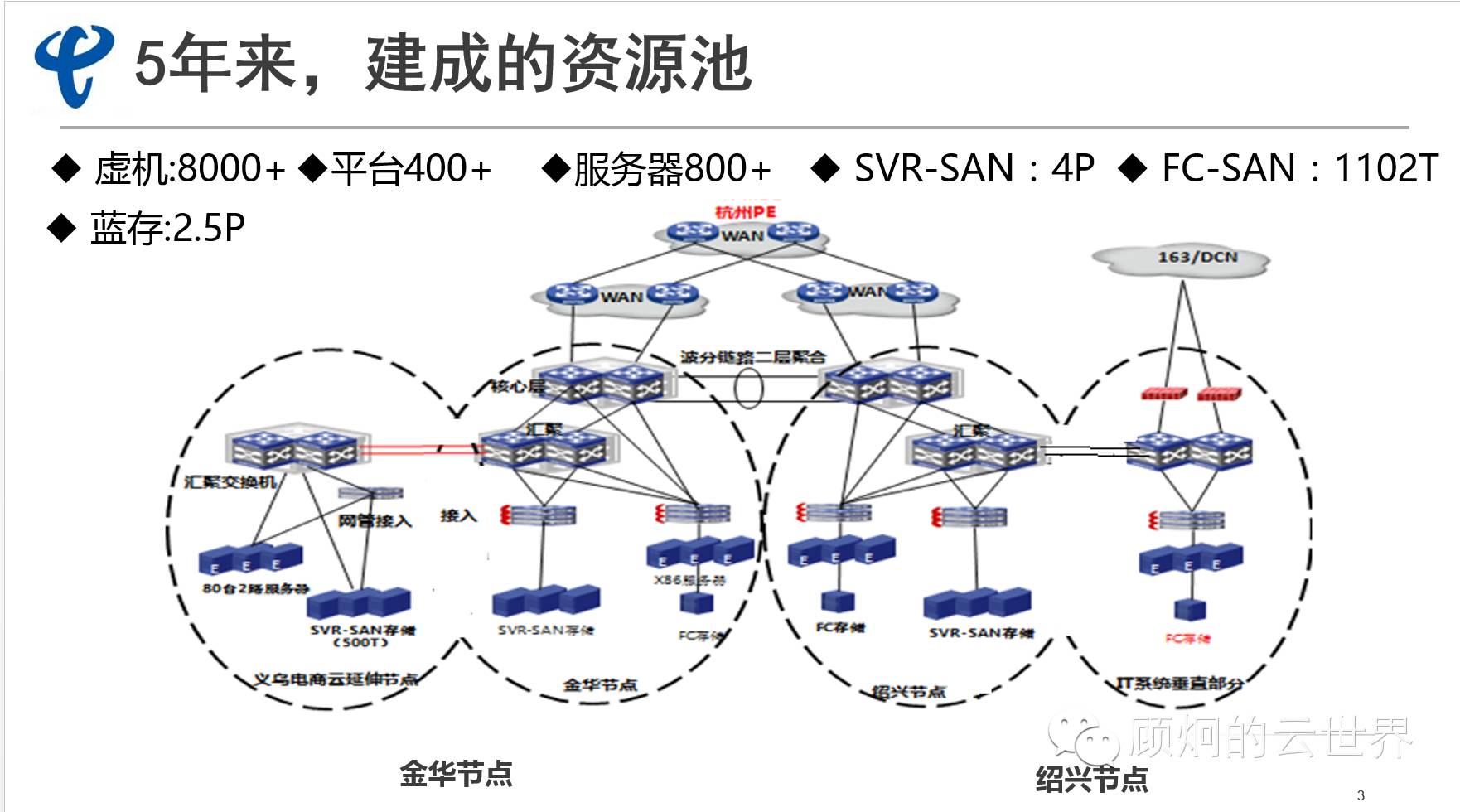 经过5年的建设和发展,实现了一个软件定义、双活、安全的“内外一朵云”的用户自定义云计算资源池体系。2015年整合了IT系统、大数据硬件平台形成了以核心交换机远距离虚拟堆叠,大2层互通的,金华、绍兴二个物理节点的统一资源池。网络采用核心交换机-接入交换机扁平设计。后期引入SDN的虚拟网络作为补充。二个物理节点各有一个网络出口,业务可以根据实际情况选择主备路由。目前资源池内上线了800多台各类服务器,100多台网络设备,4P的SRVSAN,1.5P的FCSAN,运行了400多个系统,8000多台的虚拟机。是目前业界实现最远距离的双活资源池。在中国电信集团内首先完成大型业务平台云化、首个语音类平台NVF化,是首个部署和商用SDN和SDS的资源池。目前浙江公司的大部分自有平台和政企客户的平台都运行在这个资源池内。但是资源池的规模越建越大,应用越来越多,林子大了,鸟多了,风险就更大了,一旦资源池发生故障,后果很严重。