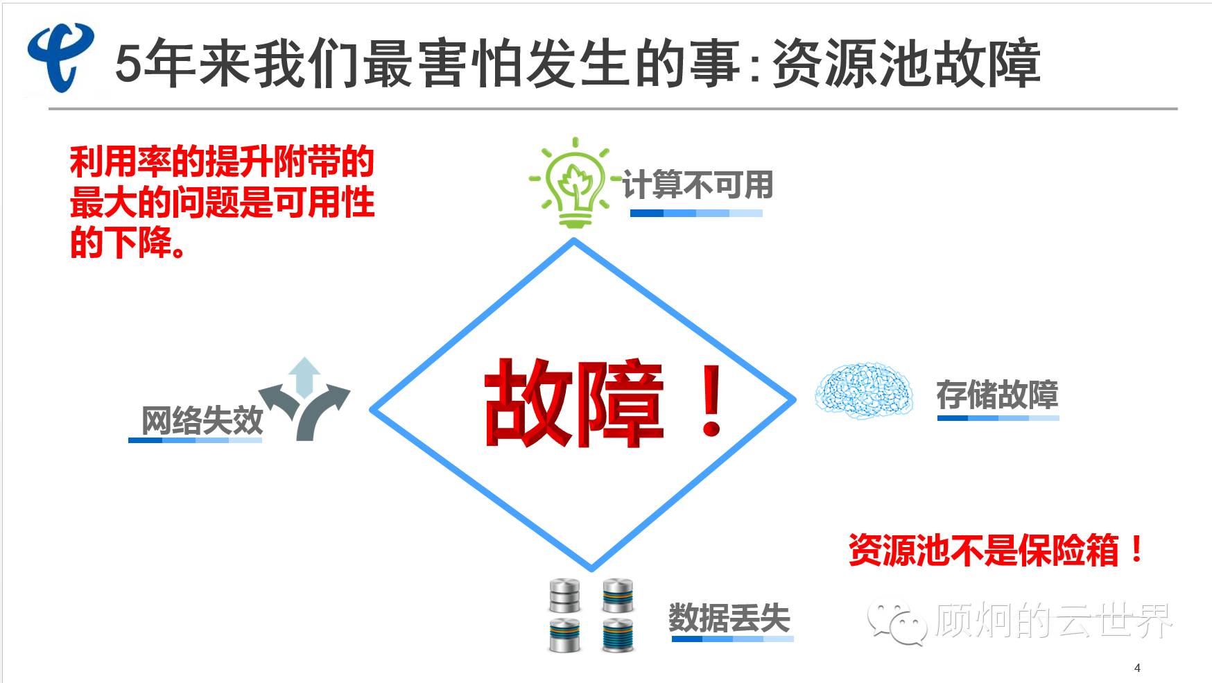 5年来我们最担心、最害怕出现的事情就是资源池出现突然故障。资源池的本质是共享IT设备,提高设备的利用率。为了实现这个目标,我们采取在原有硬件设备上增加软件的方式来实现计算、网络、存储的虚拟化,从而提高整个资源池的利用率。资源池存在硬件故障以外,还增加了虚拟化等软件的BUG引发的风险,发生故障的概率其实比物理机时代更大,我们简单的从计算、网络、存储和数据安全上做一个分析:
