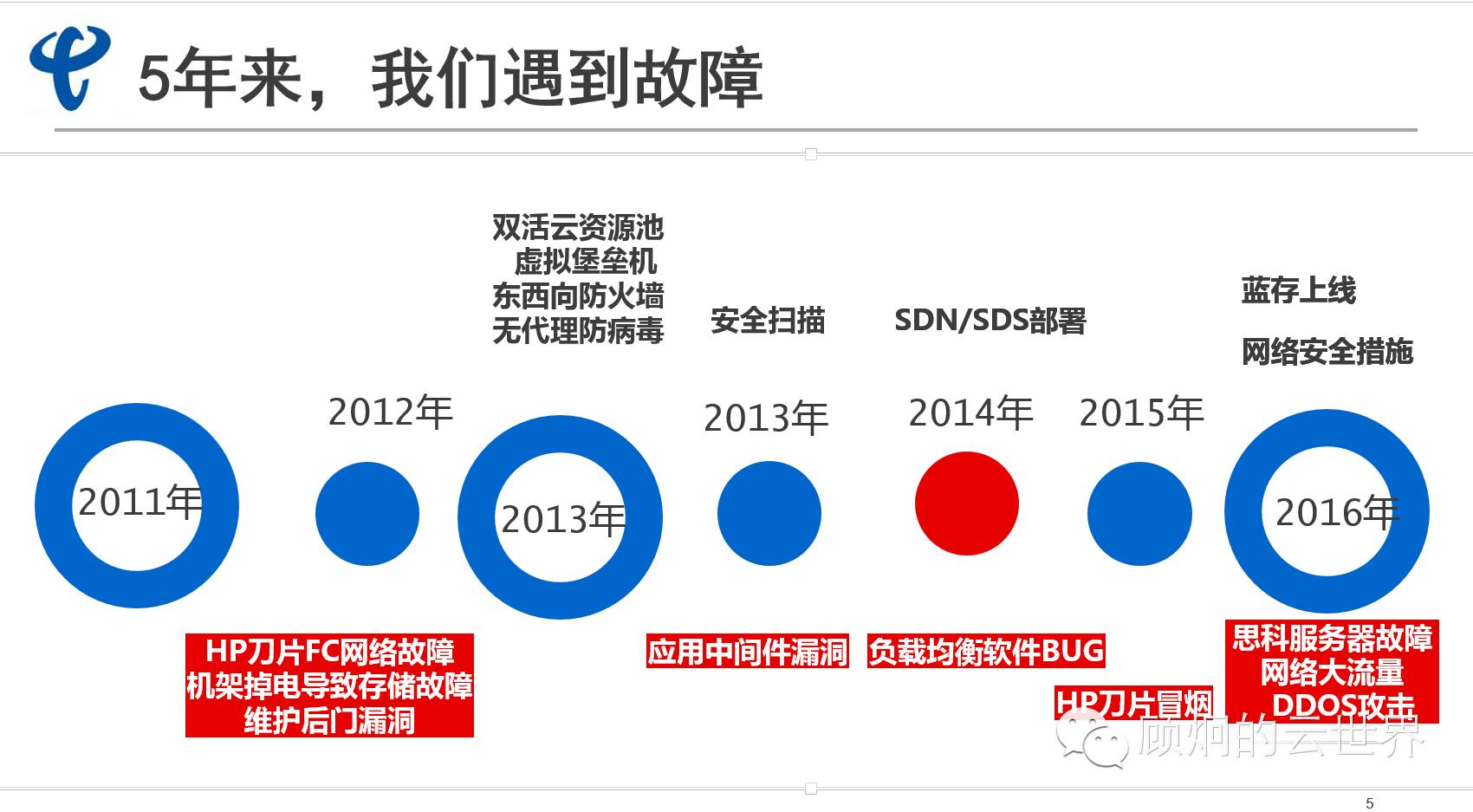 2013年出现了tomcat应用中间件配置端口在运行中没有关闭,导致资源池内的物理防火墙受到从内部的攻击;2014年出现了触发负载均衡软件BUG,导致负载均衡连接数用尽等故障。分别采用了增加安全扫描和升级软件的方法解决,同时还积极引入新的SDN和SDS技术,提升资源池的灵活性和安全性。2015年在设备安装下电的过程中,发生新服务器主板冒烟的故障,还好处理及时,没有引发灾难。