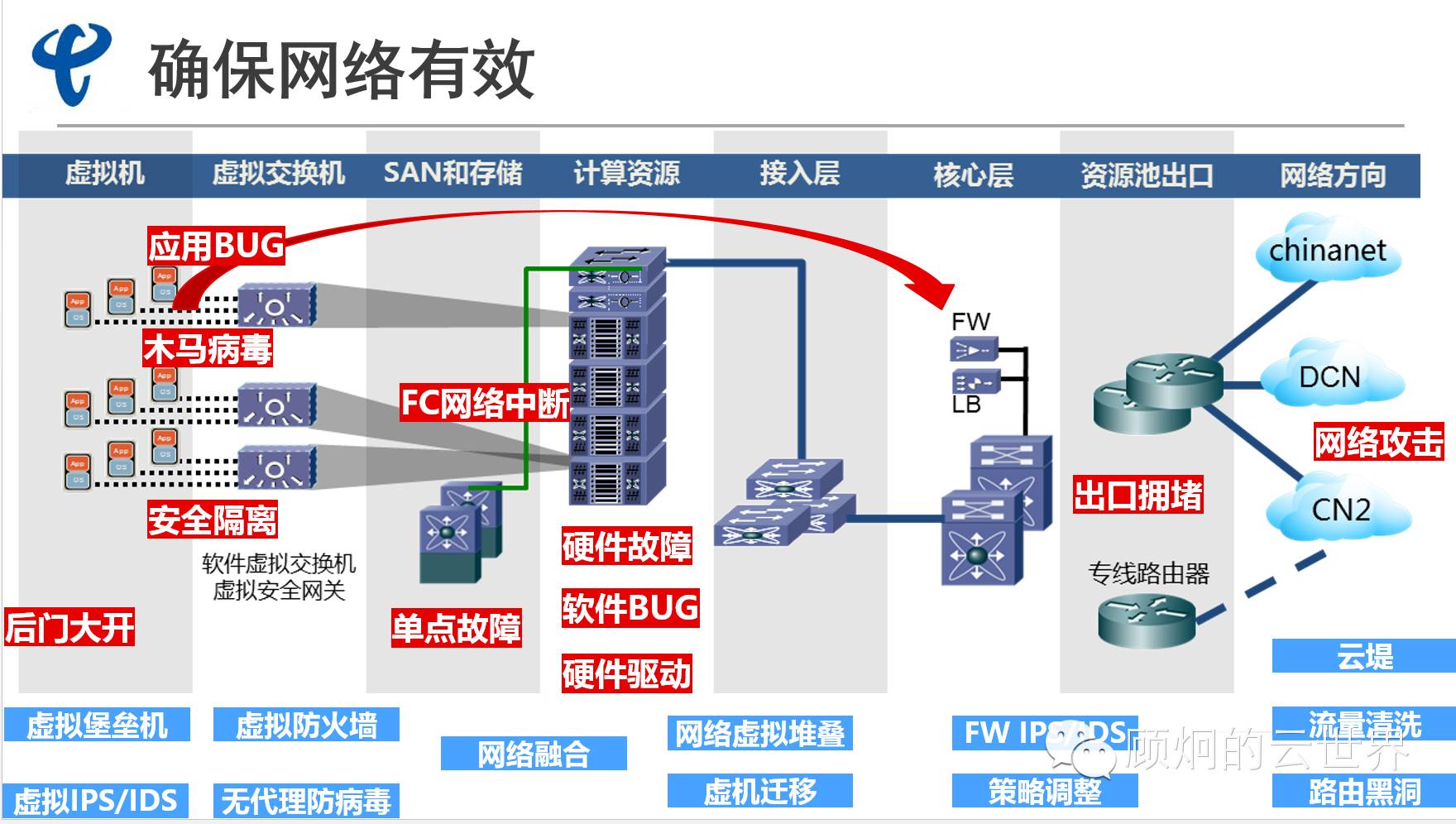 2、 资源池内的网络往往是采用虚拟化堆叠技术,二台网络设备虚拟化成为一台,二条链路捆绑聚合成为一条链路,增加了网络的安全性和提高了带宽。所以传统网络设备出现问题导致资源池出现故障的案例不多。但是在资源池内除了传统的南北向流量,还有东西向流量,这些流量是传统流量的几十倍、几百倍。虚拟网络世界的网络安全往往会触发物理网络的安全,如虚拟机内部攻击防火墙、负载均衡器的事情也发生过,而且很难一下子定位故障。另外资源池出口网络会受到上级网络的影响,出现网络拥堵和网络中断的故障。
