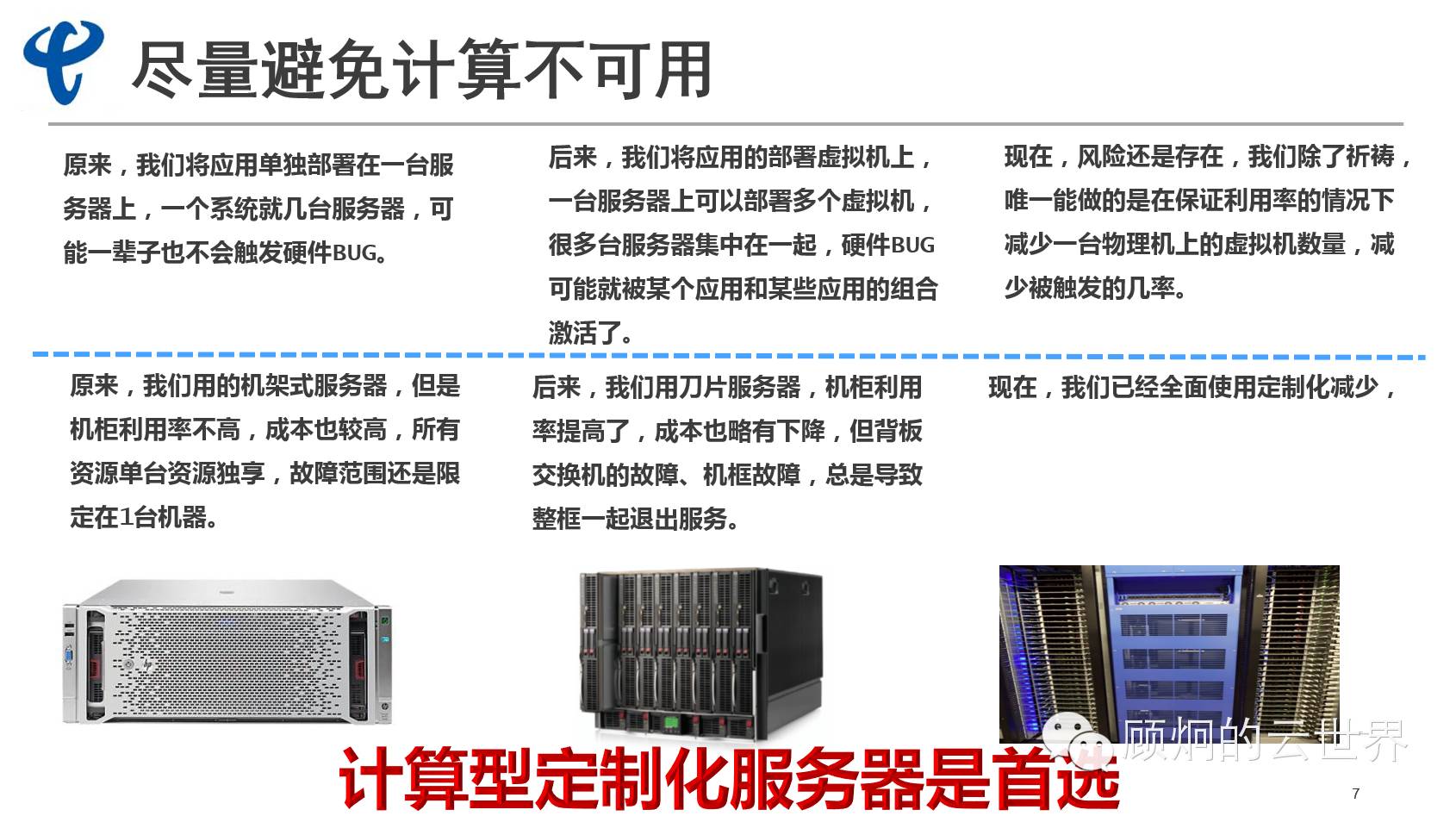 由于物理服务器的故障是不可避免的,只能采取减小物理机故障影响的范围,即采用相对小规格的计算能力的服务器,每台服务器最好没有关联性,一台服务器发生故障不会波及其他服务器。浙江公司在2013年作为试点省,尝试使用2路8核的计算型服务器来承载虚拟机,起到了很好的效果。在资源池建设的初期采用的是PC服务器,机柜利用率不高,价格贵,但发生故障的时候,仅限于单台服务器;后来采用刀片服务器,机架的利用率提高了,成本也降低了,但是一旦共用部分出现故障,影响面很大;现在我们采取兼有PC服务器和刀片服务器特点的定制化服务器。