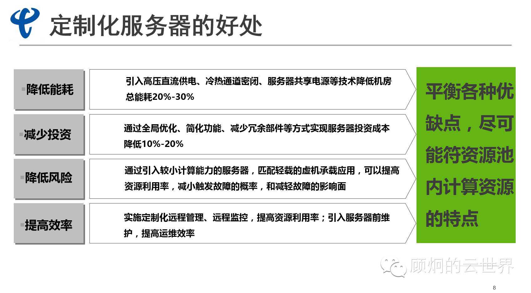 定制化服务器采用高压直流供电,冷热通道分离,共享电源、,达到节能降耗的目的,节能达到20-30%;通过局部重点优化,简化功能、减少不符合特点的部件,达到节约投资的目的;降低投资20%以上;