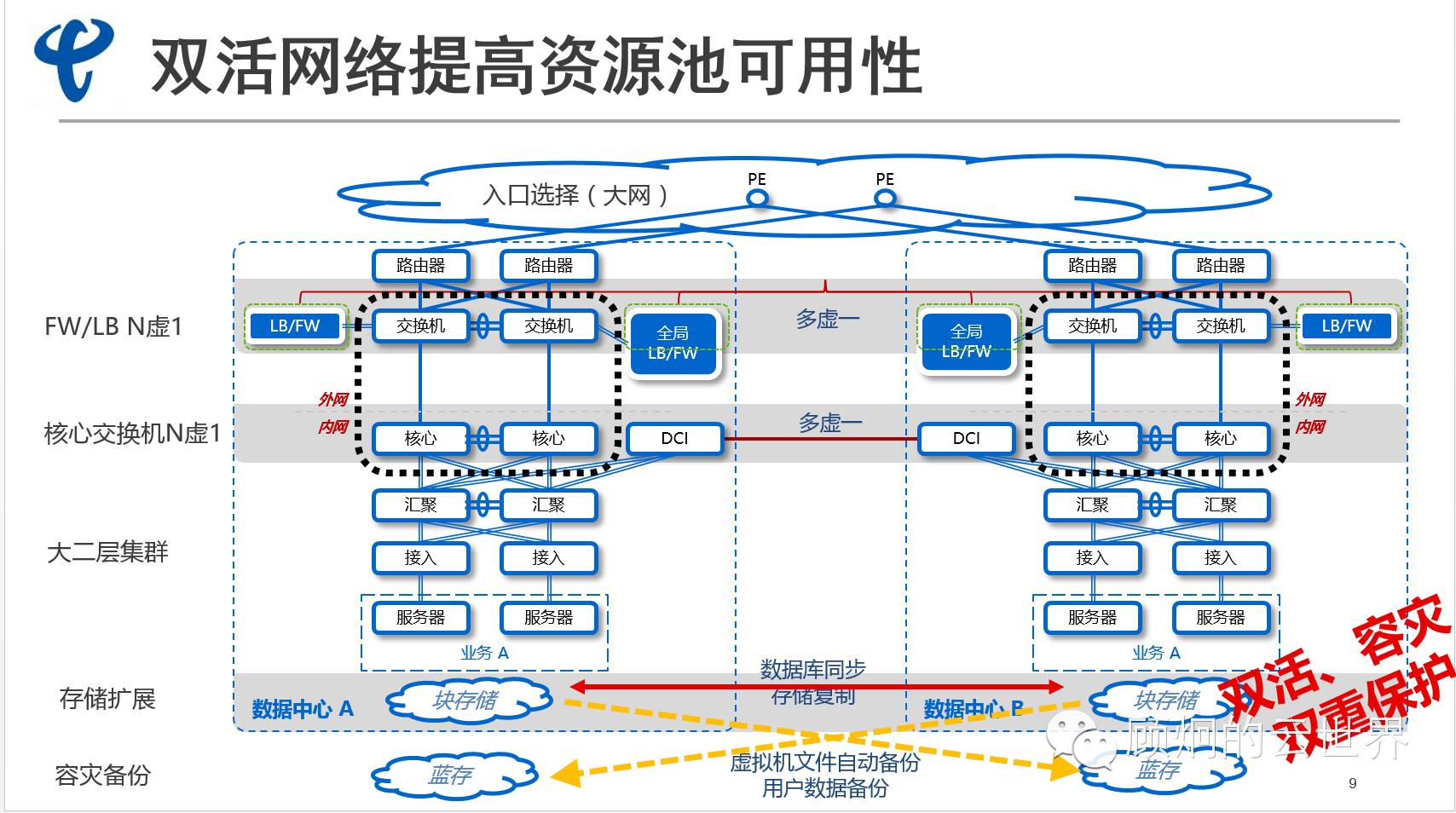我们利用核心交换机远距离虚拟化堆叠,形成跨域的大二层网络,不管服务器部署在那个物理节点上,实际都部署在同一个资源池内。但是不同物理节点采取不同的电源系统、有相对独立的网络架构和计算、存储资源,同时发生故障的概率很低。对于重要的业务系统采取双活部署,通过将应用部署在2个物理节点负载均衡,数据库同步或存储同步的方式,可以大大降低资源池故障带来的对业务的影响。同时双活部署可以取代大部分容灾部署的功能,而且相比容灾还有出现故障不中断业务、成本低等特点。但是静态数据的容灾功能也不能完全取代,比如要恢复到某个特点时间的状态,基于北京研究院研发的蓝存,就能实现数据的异地自动备份和灾难时候系统的快速恢复。双活和容灾全方面保障了资源池安全稳定的运行,保证了重要业务连续性运行。